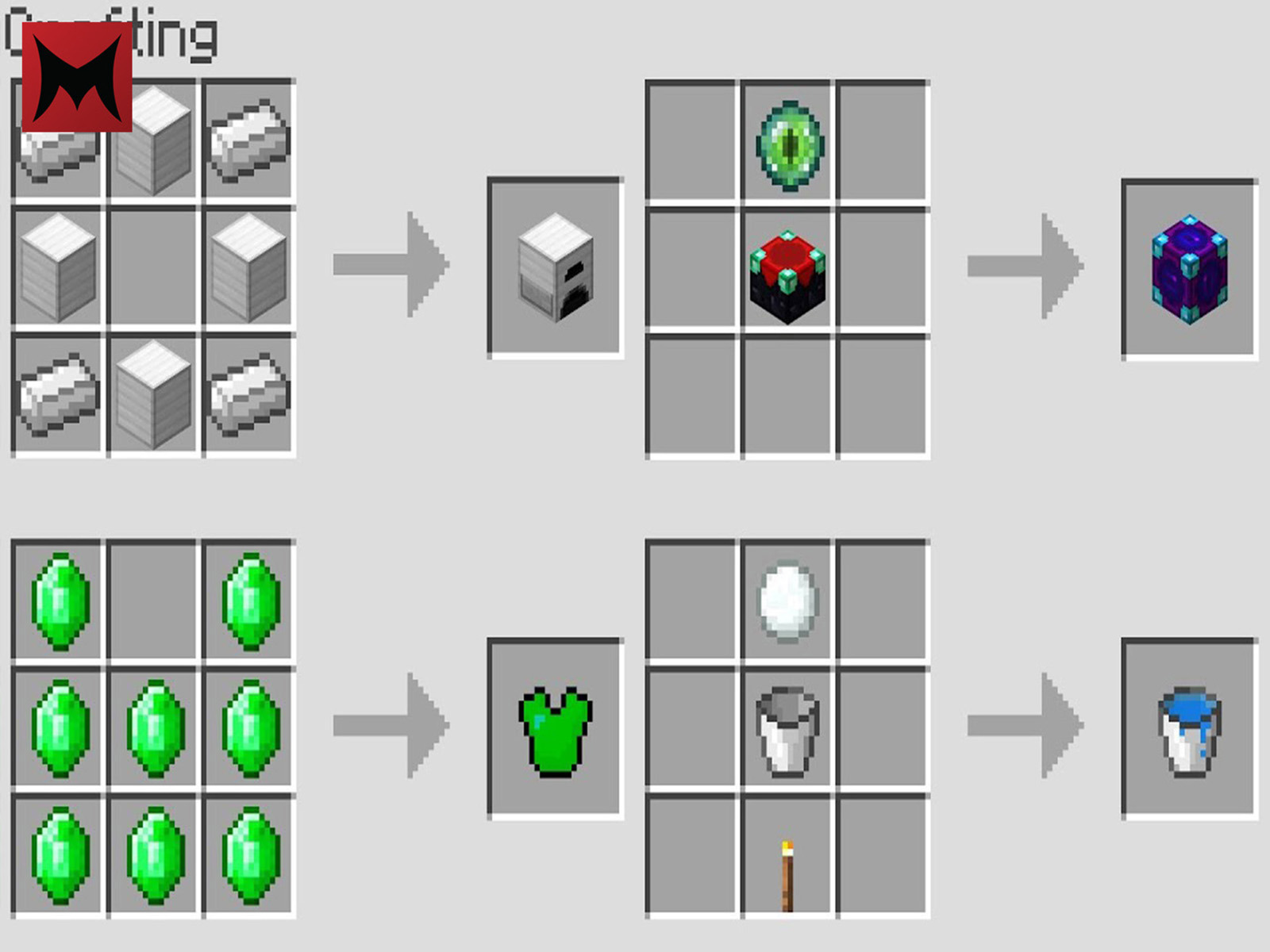 Crafting basics to craft something in minecraft move the required items from your inventory into the crafting grid and arrange them in the pattern representing the item you wish to create. Recipe mode is for if you don't want to cheat, right and left clicking just give uses and recipe, respectively. The main minecraft server contains an item.java file that lists all items along with May 06, 2015 · there's recipe mode and cheat mode for nei. This article is about the gui system for crafting. To include mods in this analysis, you'd need to decompile them as well. So you'll have to decompile the.jar files to do any useful analysis. List of crafting recipe in minecraft. Since the crafting cook exists, recipes can be viewed by the player in game, by having a shortcut for it, lot's of time would be sped up going through the crafting book looking for items. Press r while mouse is on item in inventory to see crafting recipes for it just like in nei. To craft a white bed in minecraft, you open the crafting table in your menu, add the items in the 3x3 crafting grid. Figure 3.2 a smaller recipe in the player's inventory. You take three units of wool and three wood planks from your inventory and put them in the grid to make your own bed.